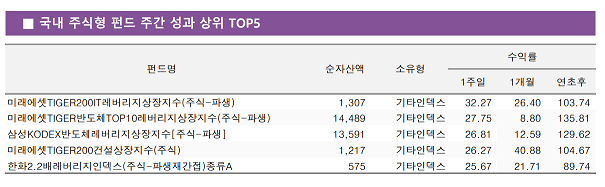 13ÀÏ KGÁ¦·ÎÀο¡ µû¸£¸é Áö³ ÁÖ ±¹³» ÁÖ½ÄÇü ÆÝµå Áß ÃÖ°í ¼öÀÍ·ü ±â·ÏÇÑ °ÍÀº ¹Ì·¡¿¡¼Â TIGER 200IT ·¹¹ö¸®Áö·Î, ÁÖ°£ ¼öÀÍ·ü 32.27%¸¦ ´Þ¼ºÇß´Ù. ¿¬ÃÊ ÀÌÈÄ ¼öÀÍ·üÀº 103.74%¿¡ ´ÞÇÑ´Ù.