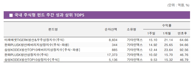 ÀÌ ¿Ü¿¡µµ 'KODEX ¹æ»êTOP10 ·¹¹ö¸®Áö ETF', 'PLUS K¹æ»ê ETF' µîÀÌ ÀÏÁÖÀϰ£ 10% ³Ñ°Ô ¿À¸£¸ç ¼öÀÍ·ü »óÀ§±Ç¿¡ À̸§À» ¿Ã·È´Ù.